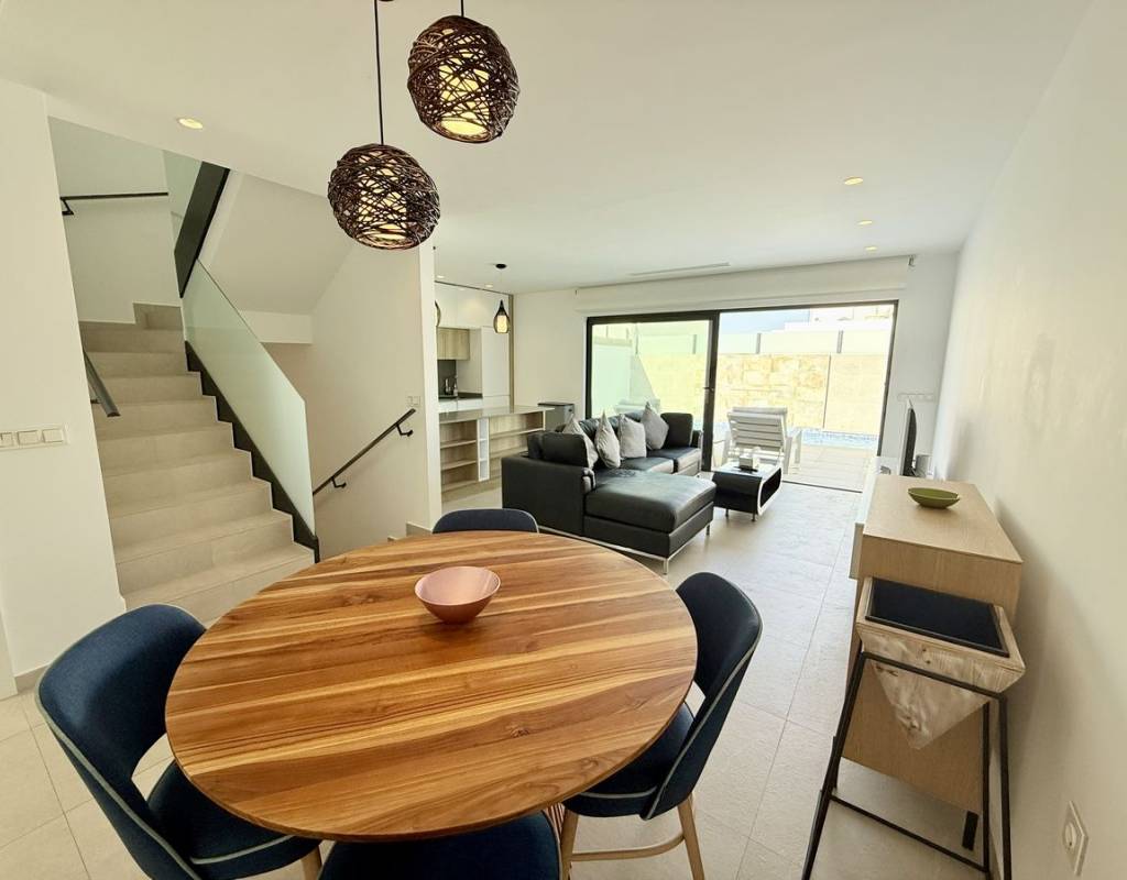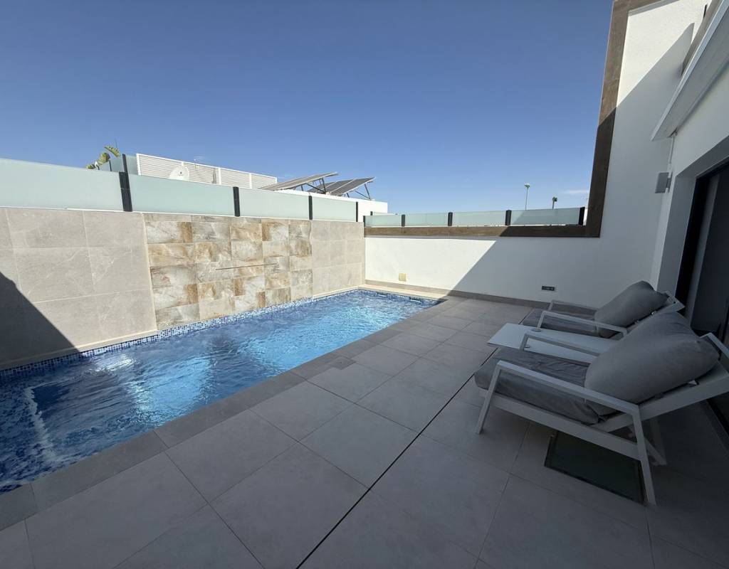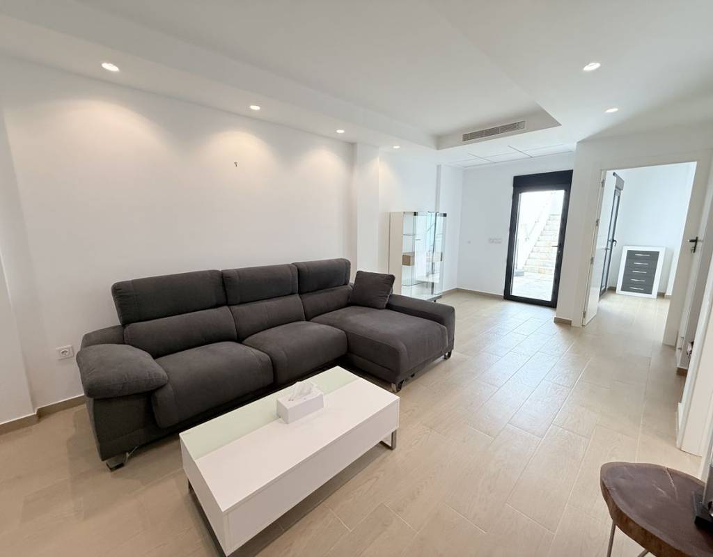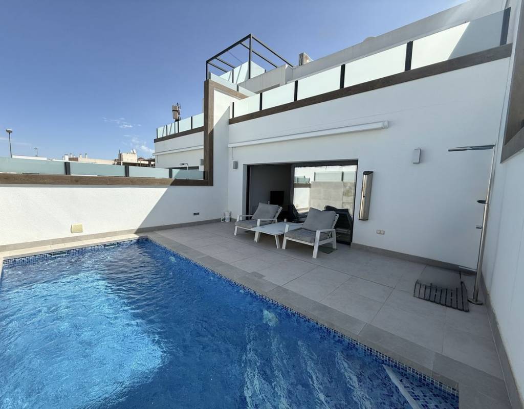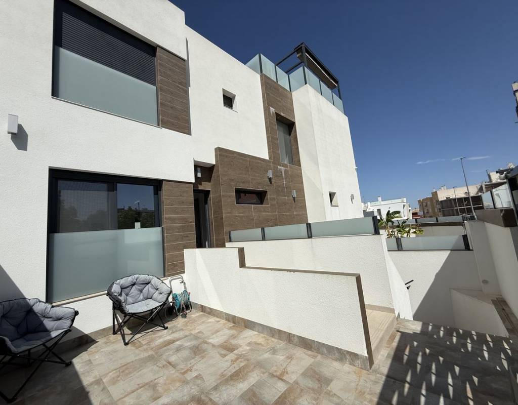 Descubra esta impresionante villa moderna, construida en 2021, ubicada en la codiciada zona de Benijófar, en la Costa Blanca Sur. Ubicada en una parcela de 85 m² con una superficie construida total de 183 m², esta propiedad con orientación este ha sido meticulosamente mantenida por su propietario original y ofrece una combinación perfecta de espacio, comodidad y estilo mediterráneo, ideal para quienes buscan una casa de obra nueva en España. La planta baja cuenta con un espacioso salón-comedor de planta abierta, una cocina contemporánea totalmente equipada y amplios ventanales que dan directamente a una piscina privada con cascada y solárium, el lugar perfecto para relajarse y disfrutar del sol español. Esta planta también incluye un dormitorio doble con armarios empotrados y un moderno baño con ducha a ras de suelo. Una escalera interior, así como una entrada independiente, conduce a la planta baja, con un amplio salón, un dormitorio doble adicional, un segundo baño, trastero y su propio patio soleado, ideal para invitados o una familia numerosa. En la planta superior encontrará dos dormitorios dobles más con armarios empotrados de suelo a techo. Uno de los dormitorios tiene acceso directo a un amplio balcón privado con impresionantes vistas a la montaña. La vivienda cuenta con aire acondicionado por conductos en toda la vivienda, aparcamiento privado con puerta con mando a distancia y se vende completamente amueblada, lista para entrar a vivir. Situada a poca distancia de todos los servicios locales, como tiendas, bares y restaurantes, esta moderna villa en Benijófar es la opción perfecta para vivienda permanente, propiedad vacacional o inversión de alquiler en la Costa Blanca Sur. Benijófar está bien comunicado con la autopista AP7, a 10 km de la playa y a 40 km de la capital y su aeropuerto. Geográficamente, se encuentra al sur de la provincia de Alicante. Su posición intermedia entre la costa y los pueblos del interior la convierte en un referente en la comarca de la Vega Baja. Benijófar cuenta con una población de 3.707 habitantes y, en continuo crecimiento, se ha convertido en el lugar ideal para vivir para muchos ciudadanos europeos.