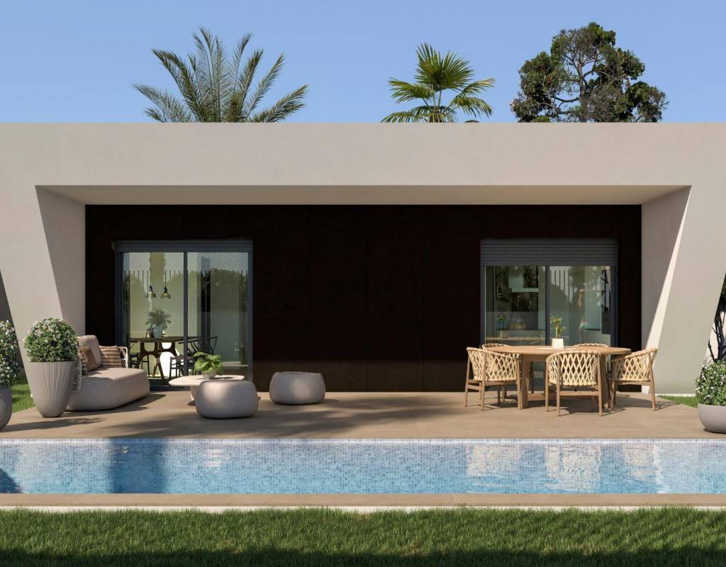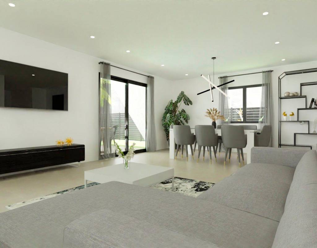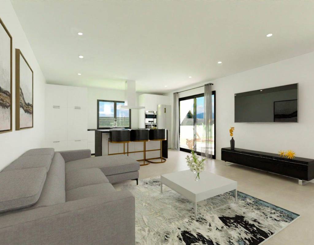 NEW BUILD VILLAS IN MONFORTE DEL CID New Build villas in Monforte del Cid, with the golf course just 3 minutes from home and right next to the cities of Alicante and Elche, where you will find a wide range of culture, gastronomy, entertainment and course coast. The golden sand beaches of the Mediterranean just a step away from your new home, a space where you can enjoy days of sun and sea at any time. Villas located 3 minutes from the sports center of the Alenda Golf golf course, making it the perfect location to enjoy the peace of a quiet urbanization but have all the services next to the house (Just 12 minutes away from Alicante-Elche Airport). The urbanization is a community that brings together the best of modern life and the tranquility of the natural environment (No community fees). Discover the elegance and comfort of this beautiful independent villa of 108m2 or 128m2 (possibility of two home sizes), designed to offer you an exceptional lifestyle, all on the ground floor. Located in the prestigious Urbanization, this property gives you a unique and quality living experience. On plots from 618m2, providing you with ample space to enjoy both indoors and outdoors. Enjoy the privacy offered by this independent villa, where you can relax in your own garden, create an oasis of tranquility, or even add a swimming pool to enjoy the warm summer days. The house is distributed in two large areas: Day area: Where we find a spacious living-dining room with an open office-type kitchen (kitchen furniture included) that connects with the large modern porch through its two large windows, giving way to the outdoor garden area and why no… to the pool. Light floods every corner thanks to the large windows in the living room, which open to the porch, a modern and functional space that invites you to enjoy the outdoors to the fullest. Imagine spending afternoons with family and friends, surrounded by a serene and natural environment. As an extra space, it has a laundry area strategically placed in the distribution of the home where it will be very easily accessible from any point in the home. Night or rest area: In this area we find 3 bedrooms. The master bedroom has a large dressing room and en-suite bathroom. In addition, a second bathroom to serve the rest of the bedrooms and housing. Here you will not only find a residential community, but a place where nature and elegance intertwine to provide you with an unmatched lifestyle. Whether to establish your permanent residence, to enjoy a vacation home or if you want to invest in your future, this villa is perfect for you. Private urbanisation close to the main cities of the province of Alicante, 15 minutes drive from Elche and Alicante, as well as the airport and the best beaches. Development is located in a peaceful setting close to the Alenda Golf Course in Monforte del Cid.