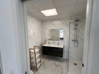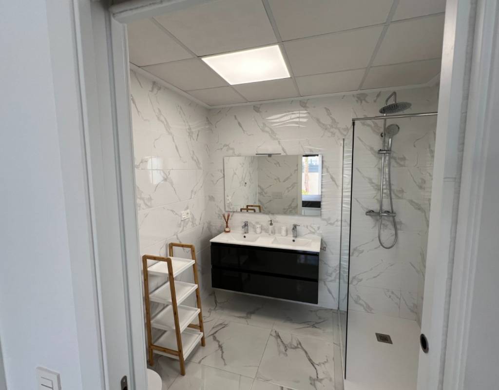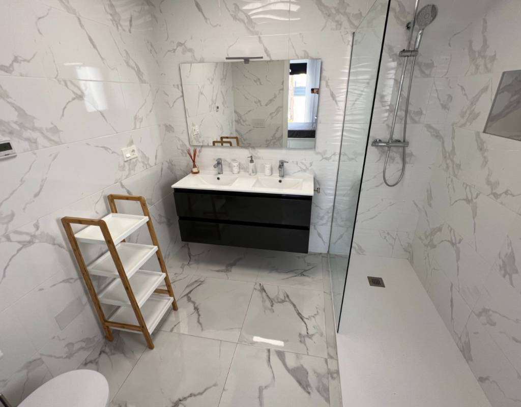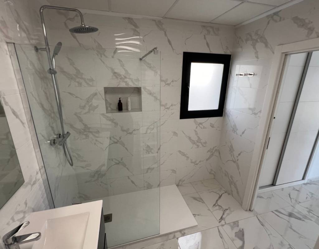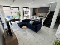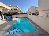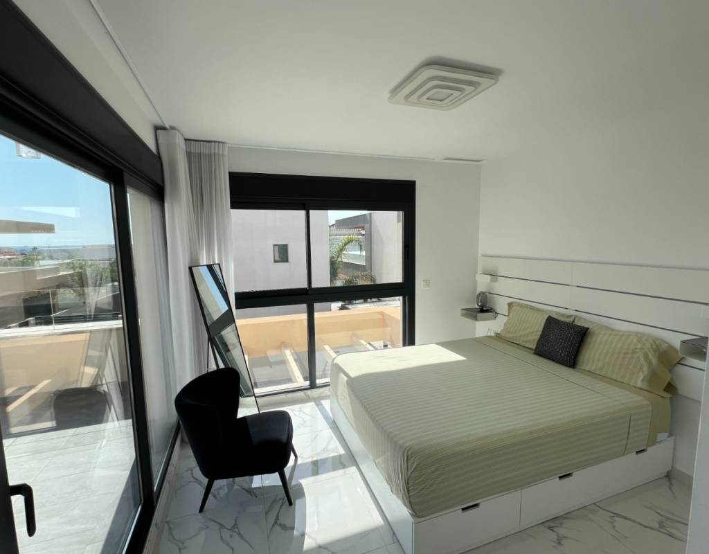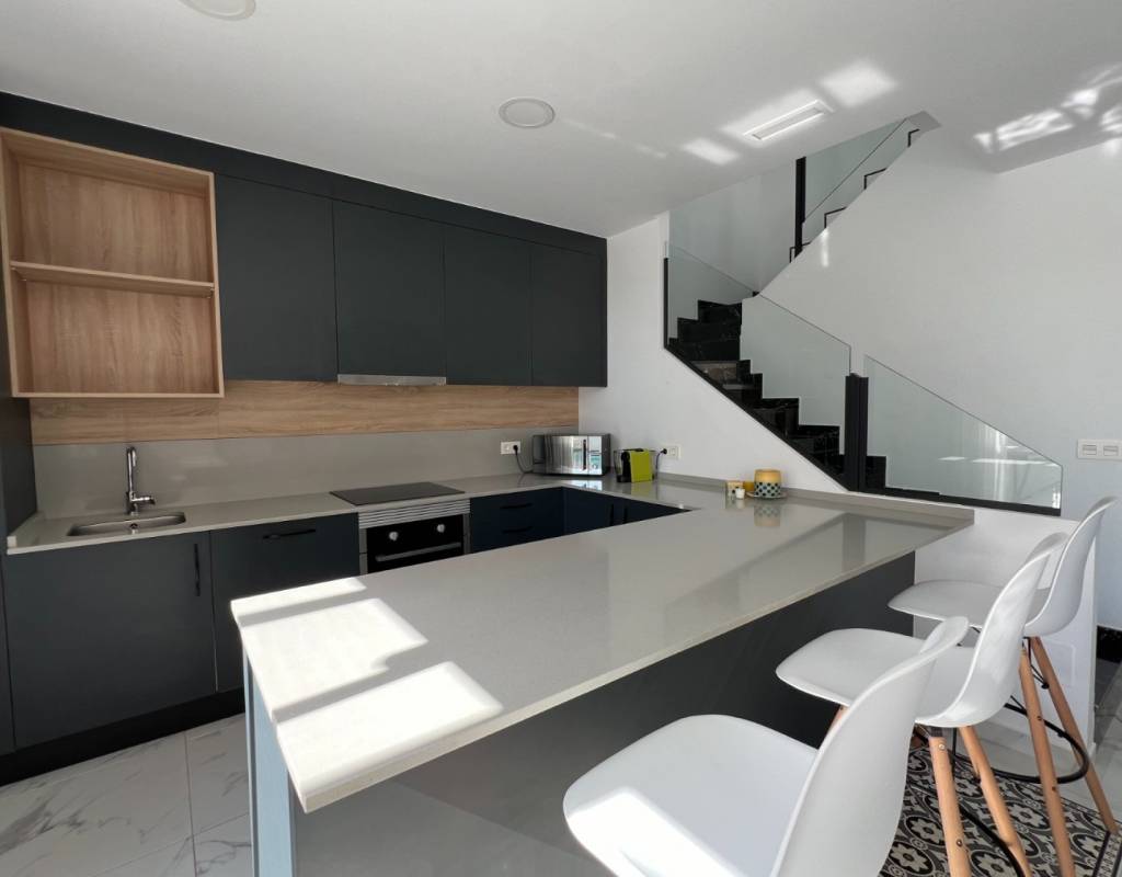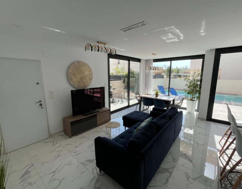 This modern villa, constructed in 2021, epitomizes contemporary design and luxury living. Situated in La Herrada, Los Montesinos, the villa covers a build size of approximately 115m² on a south and east-facing plot of 225m², ensuring ample natural light throughout the day. The ground floor is a testament to open-plan living, featuring a spacious kitchen seamlessly integrated with a lounge and dining area. Three expansive picture windows flood the space with light and provide unobstructed views of the private pool and a large sun terrace, perfect for outdoor relaxation and entertainment. The villa boasts three generously sized bedrooms, each fitted with ample closet space. Two of these bedrooms include en-suite bathrooms, offering privacy and convenience. One bedroom stands out with its access to a large balcony, an ideal spot for morning coffee or evening relaxation. In addition to the terrace and balcony, the villa includes a large solarium, providing breath taking views of the surrounding area, including the stunning salt lakes. This property is an excellent choice for those seeking a modern, stylish home in a peaceful yet well-connected area.