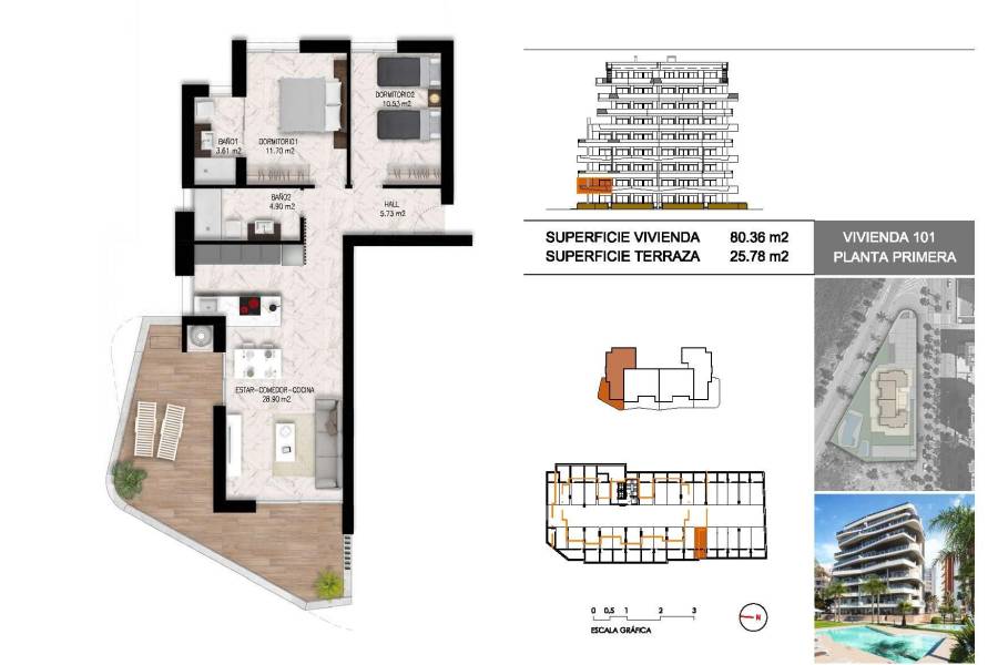 NEW BUILD RESIDENTIAL IN GUARDAMAR DEL SEGURA New Build Residential located in front of the Segura River and close to the marina and beach of Guardamar. Modern style building of 31 apartments with 2 bedrooms and penthouses with 2 and 3 bedrooms, all with 2 bathrooms, open plan kitchen with living room, fitted wardrobes, spacious terraces from 20m², underground parking and closed storage room. The building will consist of 9 floors, the highest of which will be penthouses with main terrace and private solarium. Guardamar del Segura is a town located on the Costa Blanca South. With its 11 kilometres of natural beach and its large pine forest. Guardamar is a quiet town to live in, it has all the services throughout the year such as restaurants, bars, shops, banks, places for leisure, etc. Every Wednesday, in the central streets of the town, a market is organised where many people go to buy products such as food, clothing, furniture, animals, etc. It is a great claim and inhabitants of the surrounding town come to Guardamar every Wednesday to visit the market. Guardamar del Segura has a large port with activities throughout the year, it has a large sports centre with paddle tennis, tennis, soccer and a large heated swimming pool that works all year round. It also has a library where there is free wifi and computers. Guardamar del Segura is only 20km away from the Alicante - Elche (El Altet) airport, where there are many flights every day with connections to the main European cities, due to the demand for tourists on the Costa Blanca.